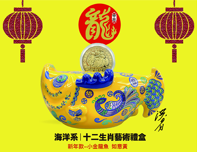 2024新春龍年限定瓷器禮盒,小金龍魚共兩色吉祥橙和如意黃,雙雙對對、吉祥如意 ;內附龍年紀念幣1枚,可作為居家辦公藝術擺件,也可使用於存錢撲滿,藝術結合生活實用,祝福2024龍年旺財、福氣綿綿。